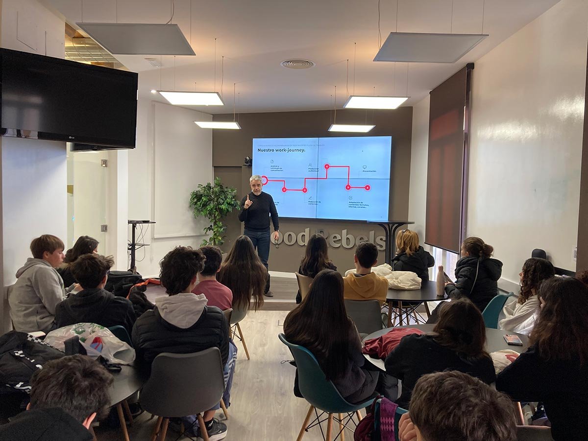 Las instalaciones de la empresa Good Rebels han acogido a medio centenar de estudiantes del IES Ramiro de Maeztu en una visita enmarcada dentro del programa Empresa Familiar en las Aulas. Los estudiantes han sido recibidos por Juan Luis Polo, presidente y socio fundador de la compañía, quien les ha explicado cómo es el día a día en una agencia de comunicación, les ha descubierto algunas herramientas de IA para acelerar los procesos dentro de un flujo de trabajo y les ha recordado que la IA formará parte de la mayoría de los puestos de trabajo en un futuro inmediato.