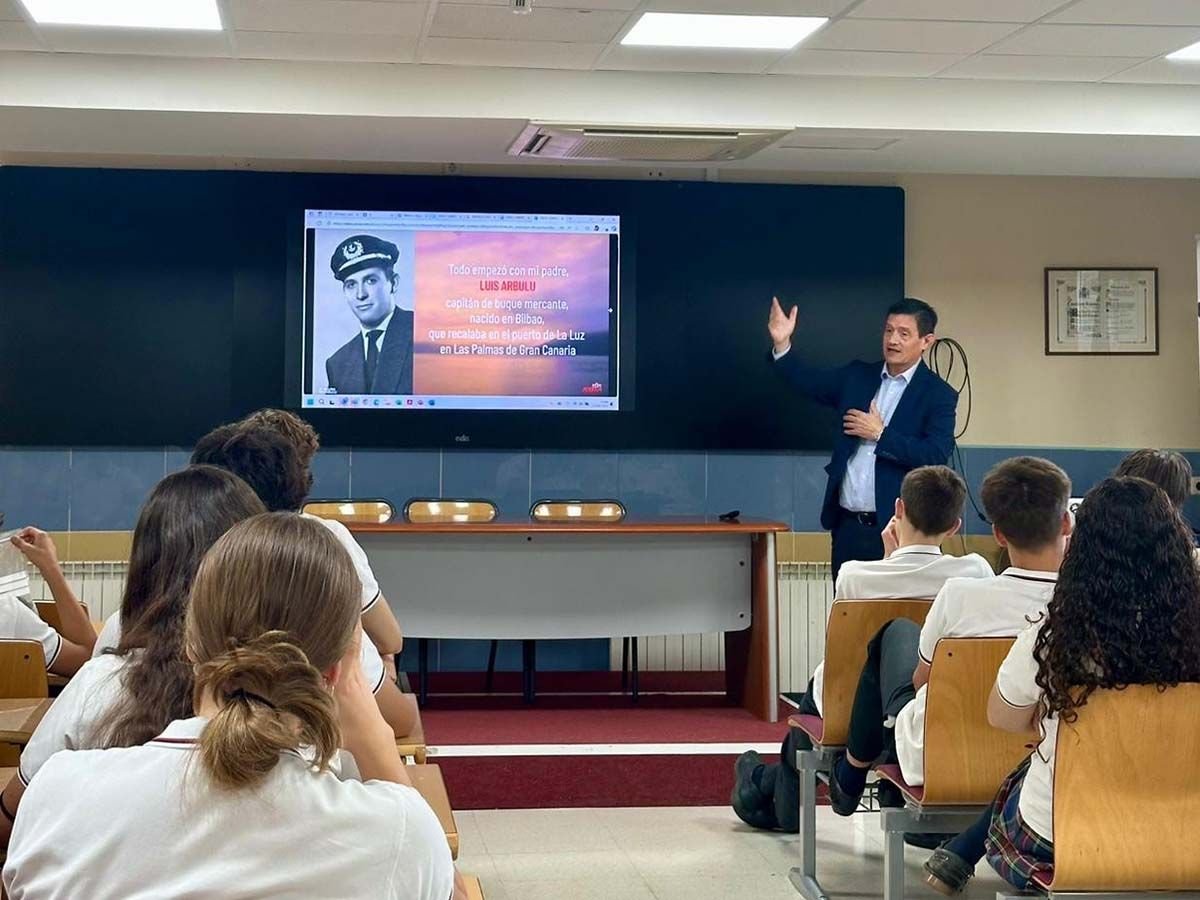 Durante su charla, dirigida a 50 alumnos de 3º y 4º de ESO, Iñaki explicó la historia de su empresa familiar desde 1969 cuando Luis Arbulu, padre de Iñaki, fundó la empresa, dedicada en sus inicios a equipar barcos, principalmente del sector pesquero de altura. En 1999 decidió diversificar abriendo su actividad a mega yates y a la internacionalización de la compañía. Hoy son 9 las empresas que conforman el grupo, especializado en electrónica naval y comunicación satelital, con una plantilla de 647 empleados y con presencia en 27 países.
