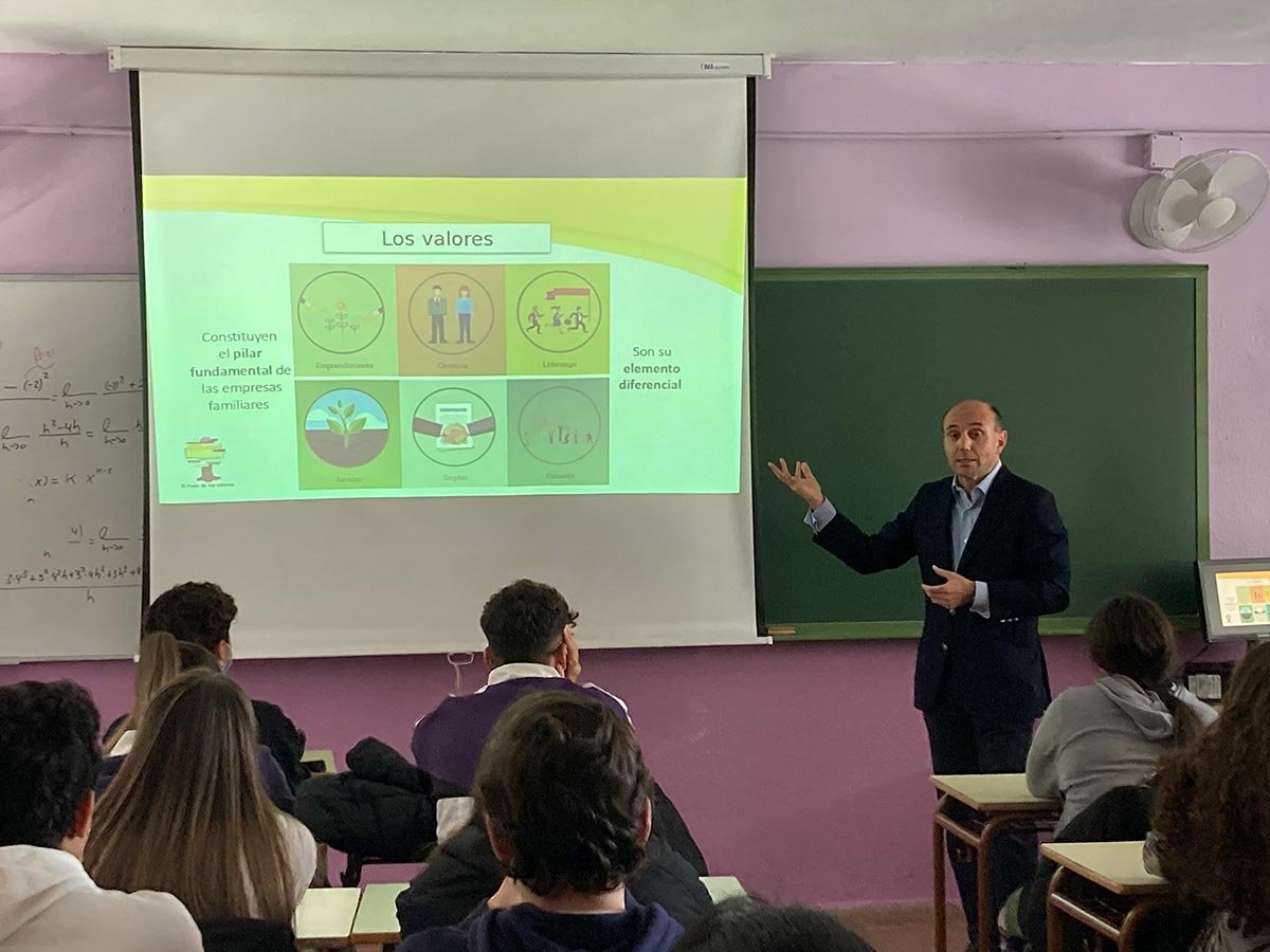 Durante la visita Ángel Roca charló con un grupo de 35 alumnos de 1º de Bachillerato a los que acercó el mundo de la empresa familiar conversando con ellos sobre cuáles son las características distintivas de este tipo de empresas y sus valores diferenciales. También les trasladó su propia experiencia y la de su familia como emprendedores y empresarios familiares.